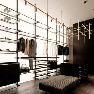 When selecting a column style wardrobe, hardware is an important part of ensuring quality. If it is only for the sake of temporary affordability, it will cause some trouble for future maintenance. In our changing room, we can design a seat or retractable pull rod, which can also be used to sit or hang clothes when changing. This is actually a very user-friendly design