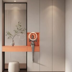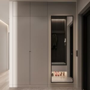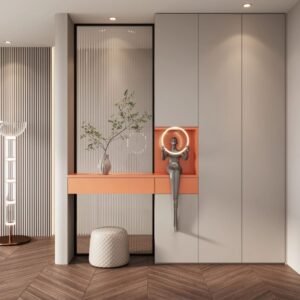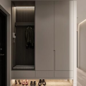 convenient location for individuals to store and retrieve their shoes upon entering or leaving the house. The design of shoe cabinets often includes shelves, compartments, or drawers specifically tailored to accommodate various types of footwear.