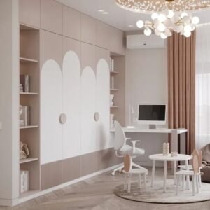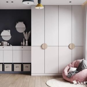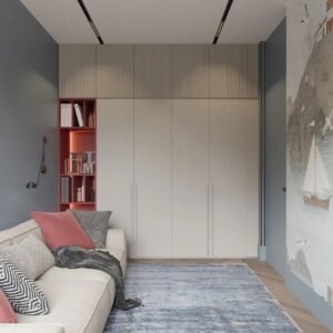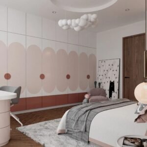 The decoration style of the children’s bedroom is minimalist, with the main color being pink. The walls are designed with light gray wallpaper and solid wood flooring with a glossy wood color, presenting a warm feeling. The wardrobe design connects with the shelf and bookshelf design, creating a warm feeling for the children.